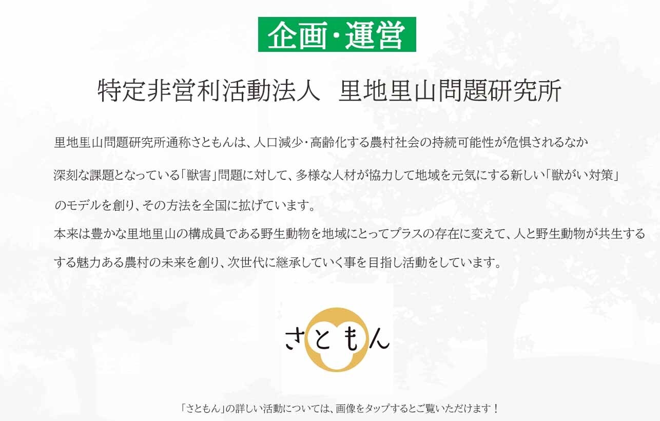 地域で獣害対策をきっかけに地域を元気にする新しい「獣がい」対策については、さともん独自のアプローチやこれまでの成果、今後の課題等を詳しくご紹介しながら、参加者の獣害発生状況や対策取り組み状況に応じた助言をいたし